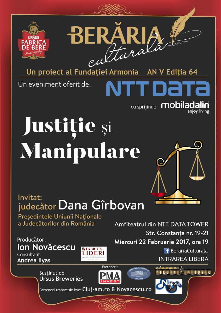Judecătorul Dana Girbovan, cea căreia Premierul României i-a propus să devină Ministru al Justiției si care a declarat ca a respins aceasta propunere, a vorbit despre Justiție și manipulare la „Berăria Culturală”, în 23 februarie 2017.