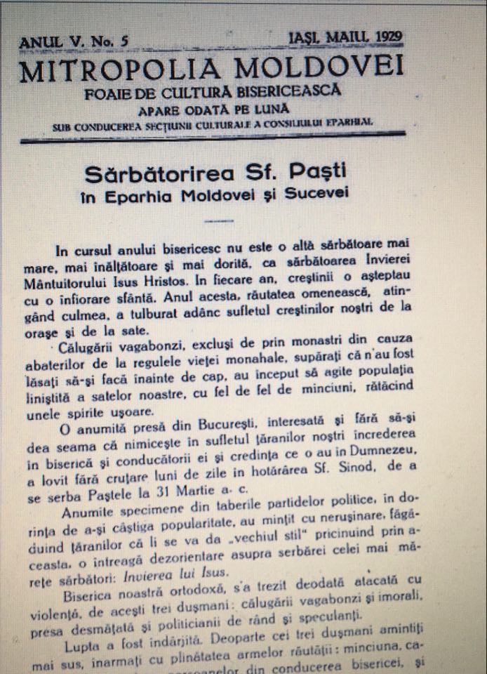 declanșării unei crize spirituale și religioase, care a durat 10 ani. Până la sfârșitul anului 1929, și mai ales în acel an când în România Paștele s-a oficiat de două ori, spiritele au fost încinse și psihicul național a avut de suferit de pe urma mai multor evenimente. Subliniem că în epoca interbelică peste 80% din populația României era formată din țărani și aproape în același procent populația era de credință ortodoxă.